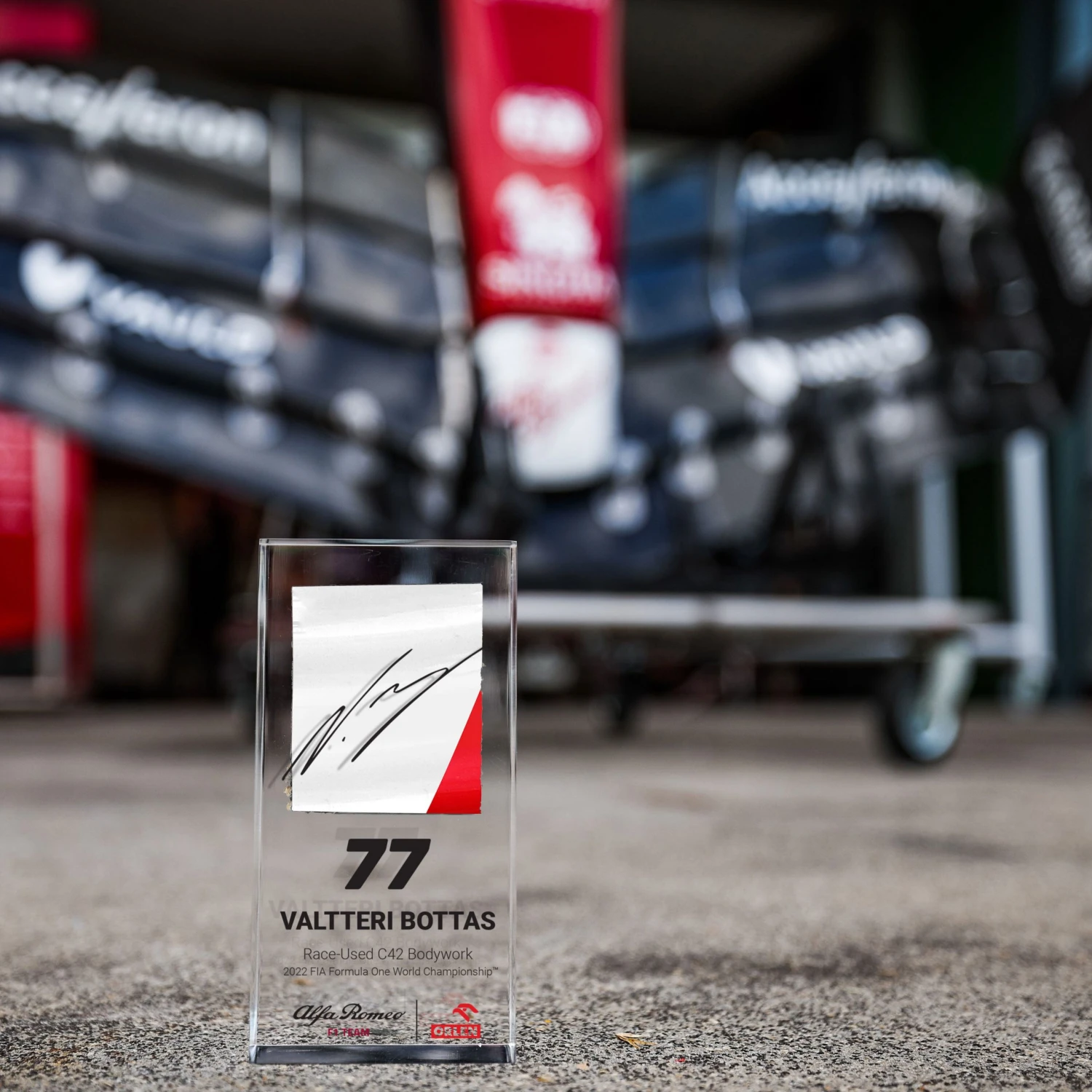 Each piece of bodywork has been hand-cut from Bottas’ 2022 C42 car, making each completely unique. Presented within transparent acrylic, you’ll be able to admire the unique bodywork from all angles.