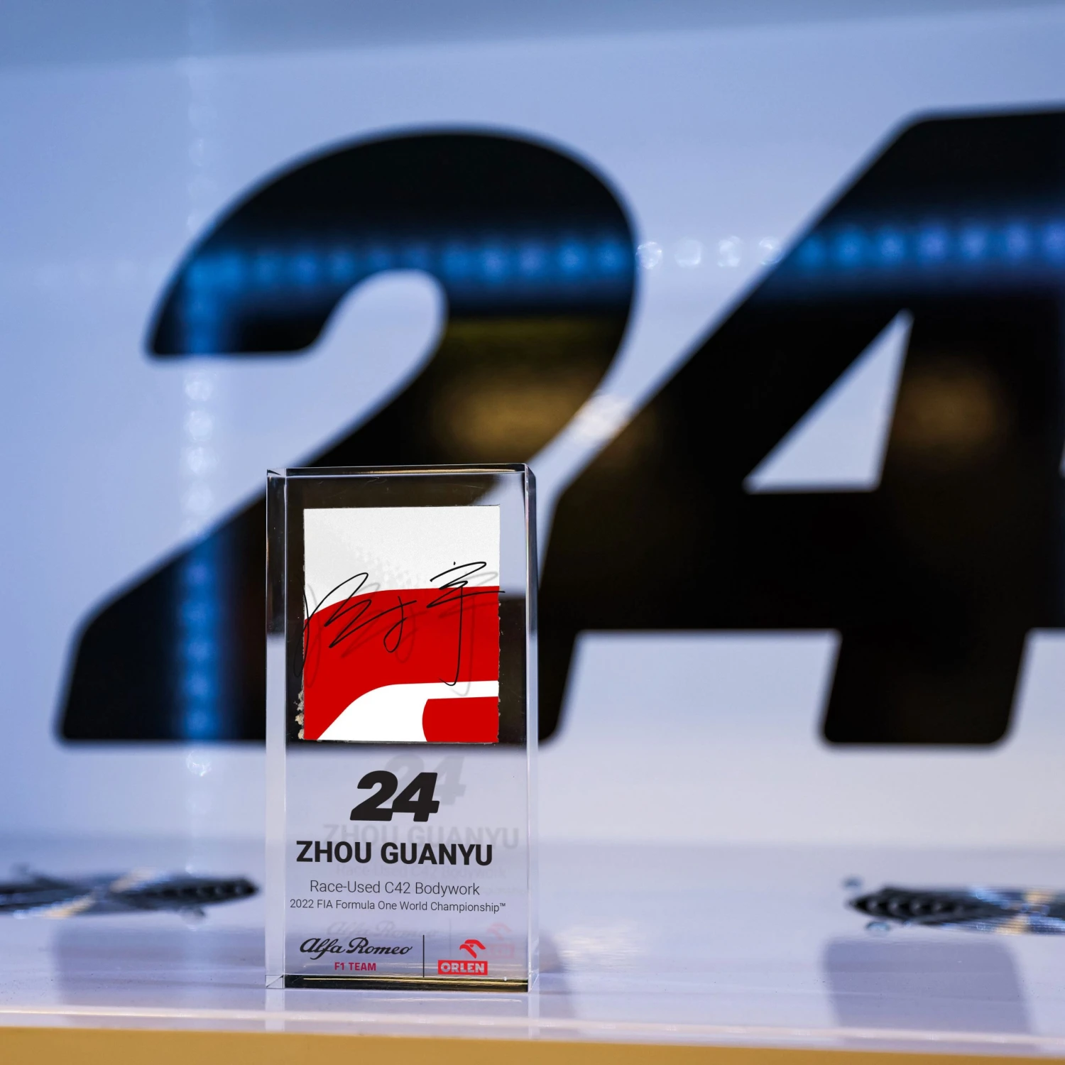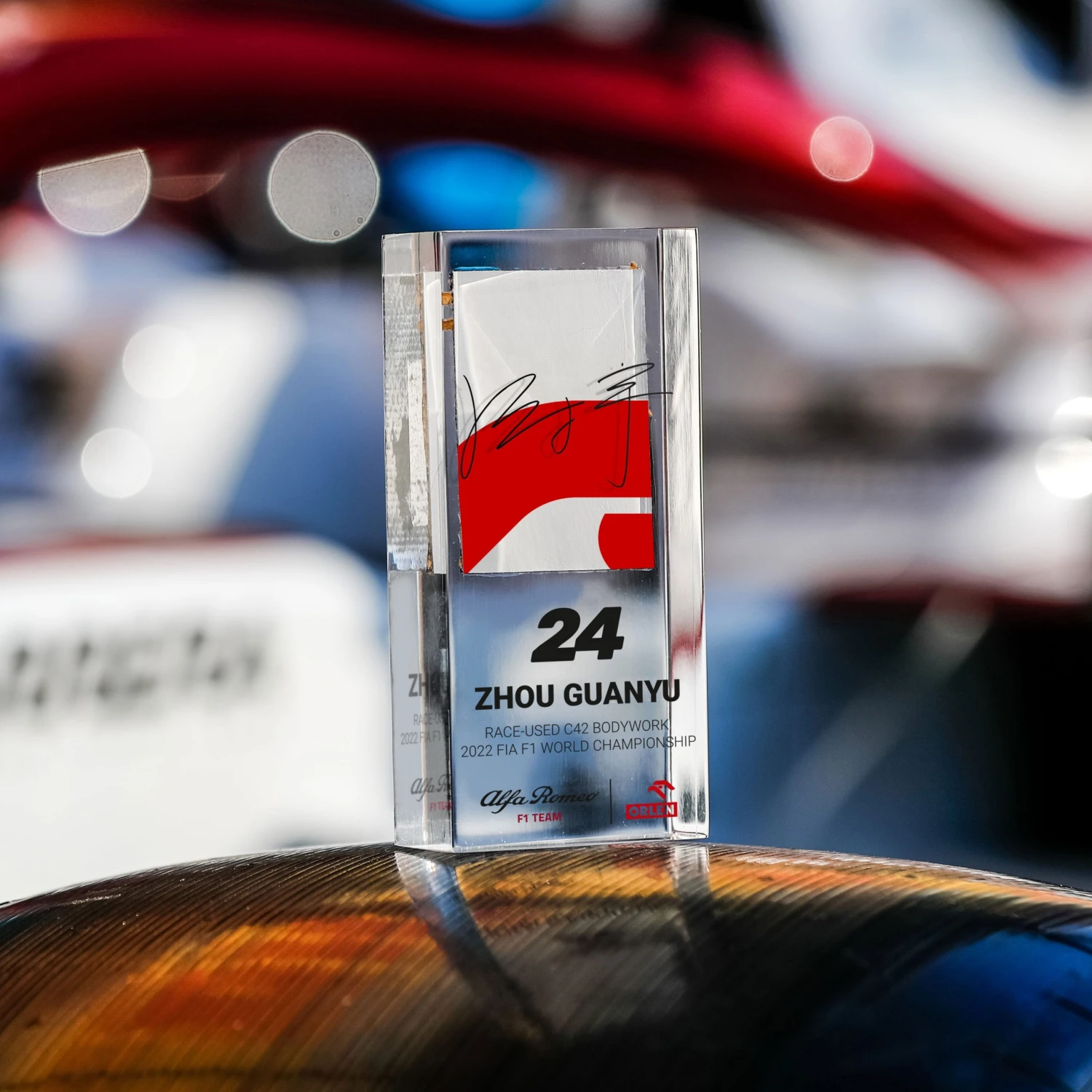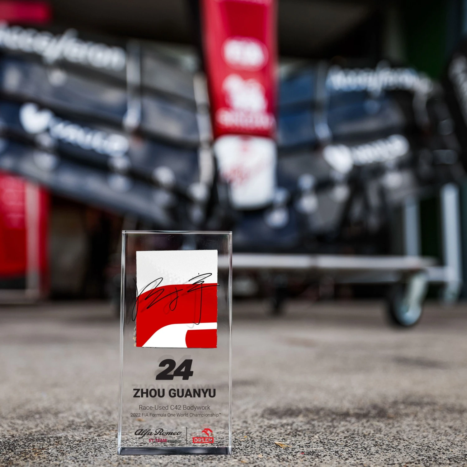 Get your hands on a piece of 2022 race used Alfa Romeo F1 Team ORLEN bodywork, embedded within sleek acrylic which features a digital floating Zhou signature.