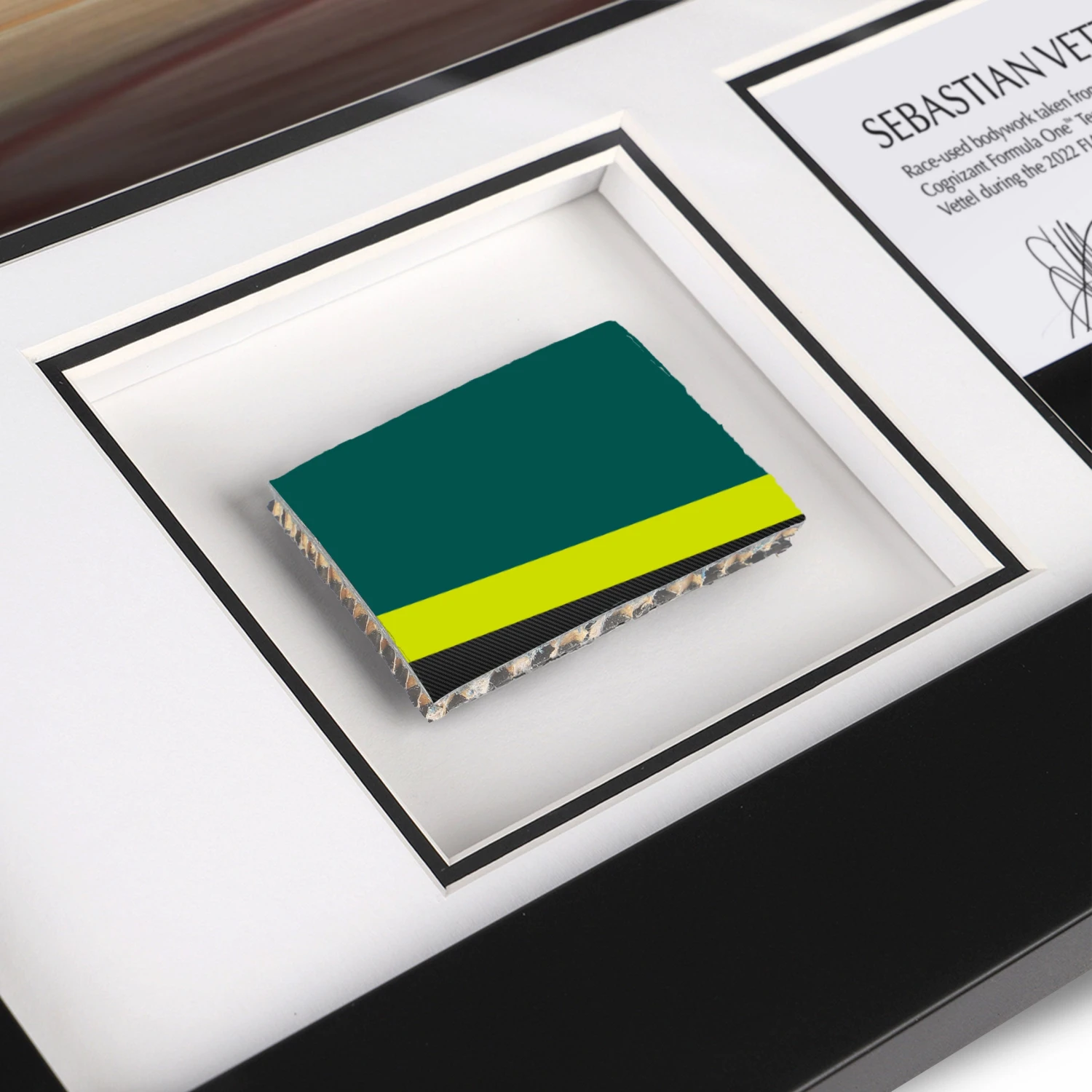 Add a race used piece of Aston Martin race car to your collection, taken from four-time World Champion, Sebastian Vettel’s AMR22, accompanied by a photograph.Â