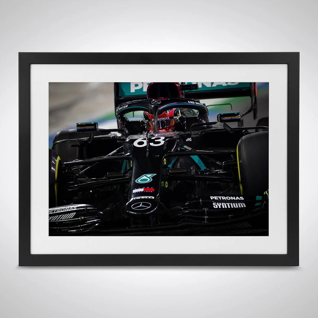 Own the moment George Russell drove for Mercedes-AMG Petronas Formula One Team! This framed photograph, taken by professional Formula 1 photographer James Moy, captures the British driver behind the wheel of his Silver Arrow at the Bahrain Grand Prix.
