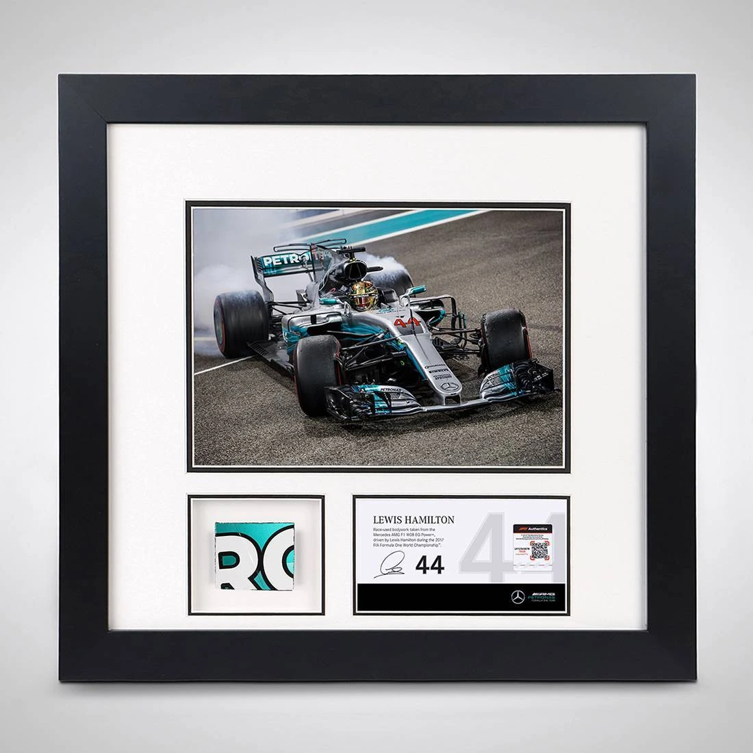 Complete with authentic hologram and a printed Hamilton signature, this bodywork and photo is the perfect piece of F1 memorabilia, and a fantastic way to celebrate the dominance and successes of one of the greatest F1 drivers of all time.