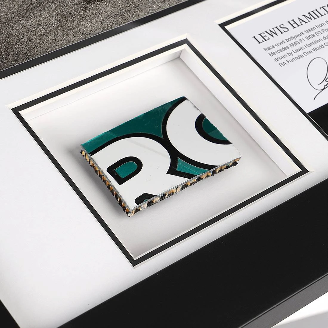 To add a touch of racing action to this impressive photograph, within the frame comes an actual race-used piece of F1 bodywork, taken from Lewis’ 2017 F1 race car. Each piece is unique!