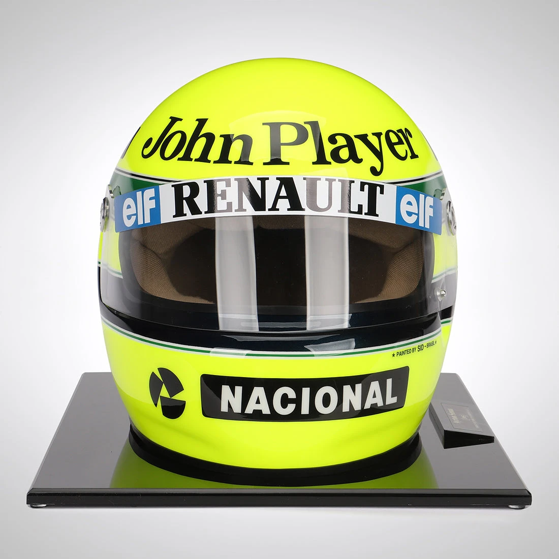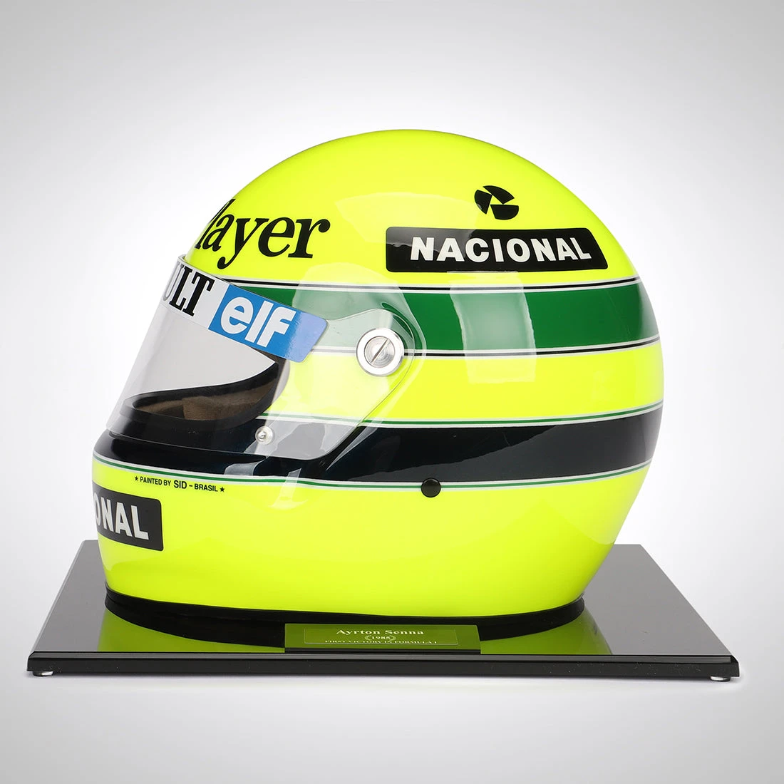 Only two Grands Prix in and he was a race winner, after clinching the top spot at the Portuguese Grand Prix. After a series of strong results and podiums, Senna finished in fourth in the Drivers’ World Championship in 1985. Replicating the real helmet Senna wore, this brilliant reproduction is the perfect way to celebrate his incredible racing career and pay homage to the legendary Champion.