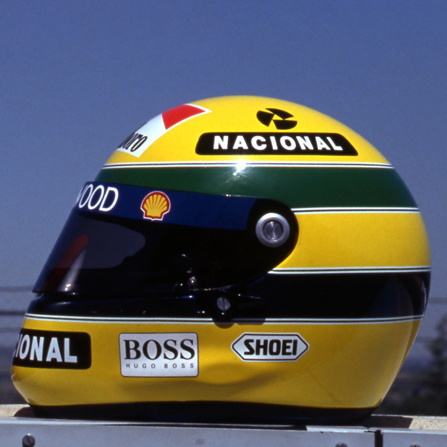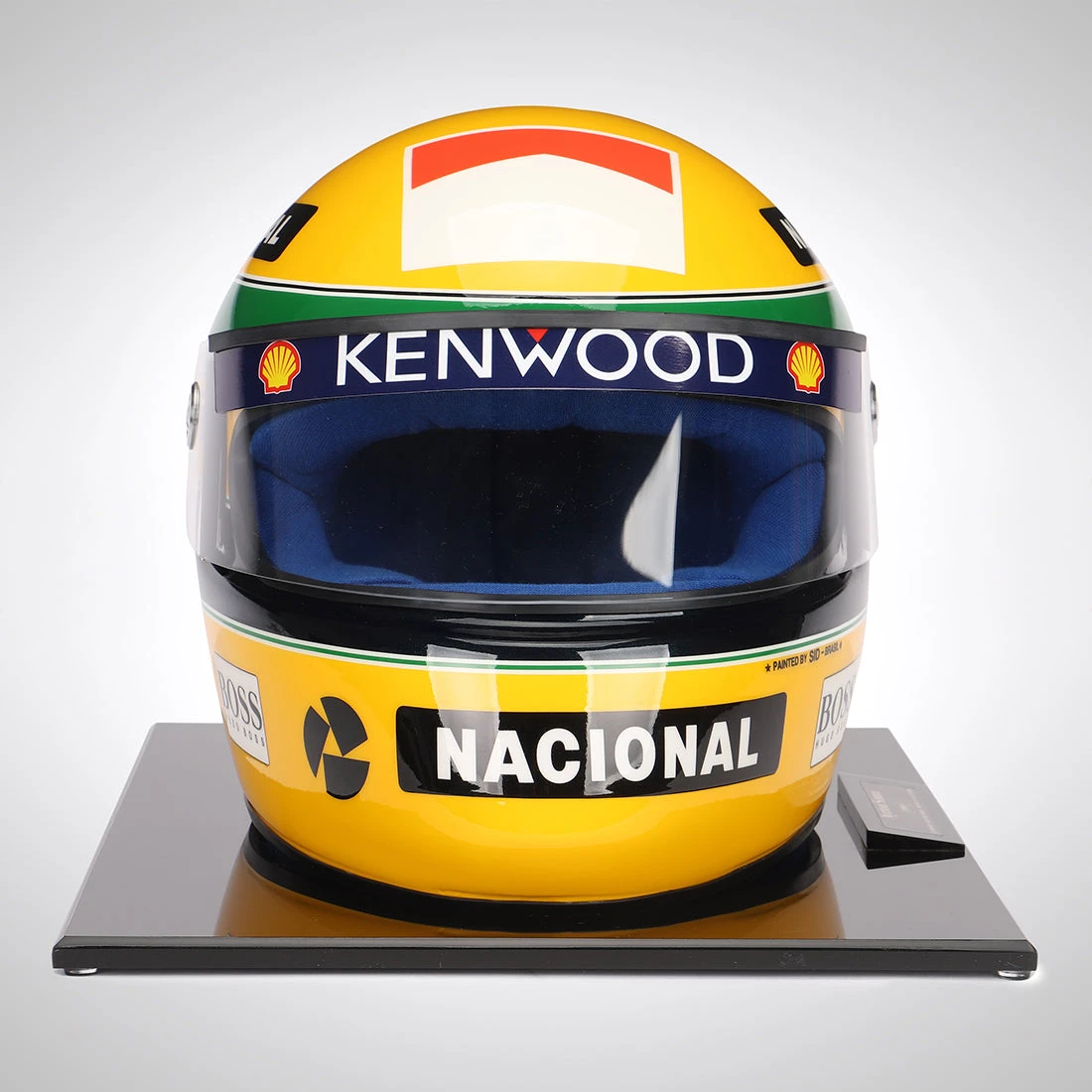 Driving for McLaren in 1993, it marked his sixth and final season with the team, having claimed three World Titles in previous seasons with the team. This official replica helmet reflects the iconic Senna design seen on Senna’s real helmet during the 1993 European Grand Prix.